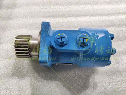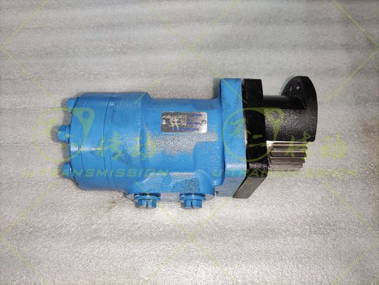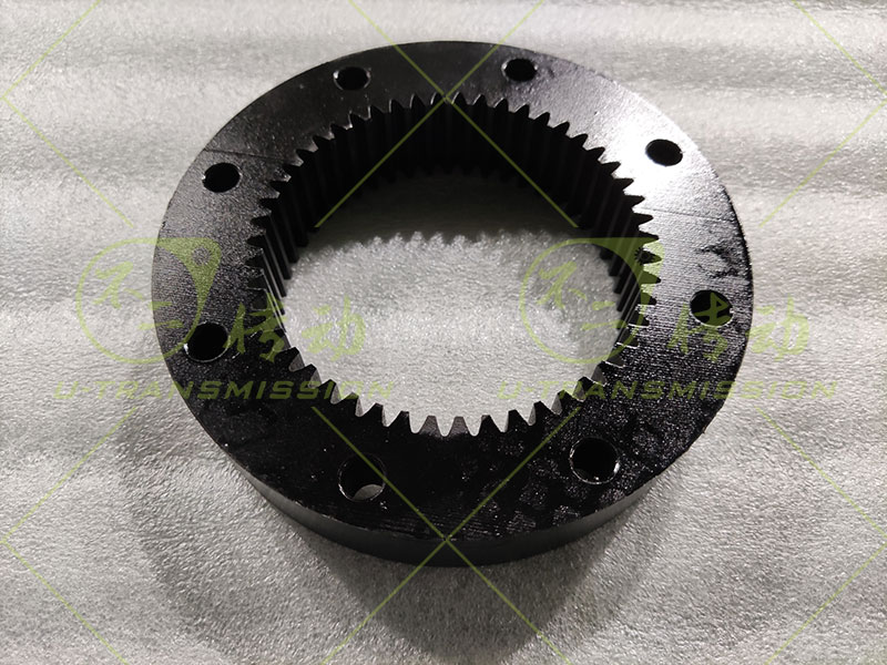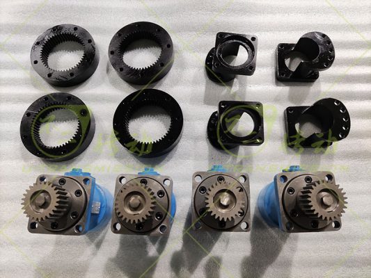 模數(shù)2的微型內(nèi)齒回轉(zhuǎn)驅(qū)動裝置應(yīng)該用在旋轉(zhuǎn)裝置上,偶爾轉(zhuǎn)動90°,安裝空間非常有限,要求體積小,工作時軸向力非常大,不二傳動設(shè)計(jì)生產(chǎn)的小尺寸的回轉(zhuǎn)驅(qū)動不能滿足客戶的使用要求。因此,經(jīng)過工程師和客戶的詳細(xì)溝通,最終決定保留客戶原來的支承方式不變,給客戶設(shè)計(jì)齒輪,內(nèi)齒齒圈,配套液壓馬達(dá),馬達(dá)支座等部件,安裝在客戶原有設(shè)備上,實(shí)現(xiàn)客戶想要的動作。