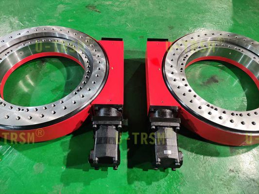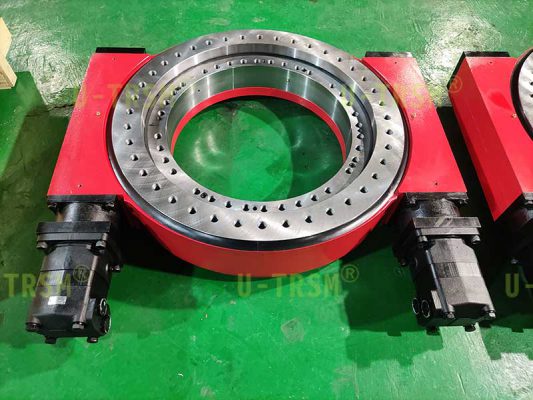 回轉(zhuǎn)支承采用42CrMo調(diào)質(zhì),蝸桿采用42CrMo調(diào)質(zhì)齒淬火磨加工的工藝,殼體使用QT450-10保證穩(wěn)定性的同時擁有高強度和一定的韌性,支承軸承選用國內(nèi)一線品牌,液壓馬達(dá)選擇BMV500,提供足夠的輸出扭矩,滿足客戶大扭矩的要求,馬達(dá)配平衡閥,使用更平穩(wěn),兩個馬達(dá)轉(zhuǎn)動更同步。適配法蘭設(shè)計的時候充分考慮了安裝拆卸的便利性,為后期馬達(dá)的安裝和拆卸提供方便。