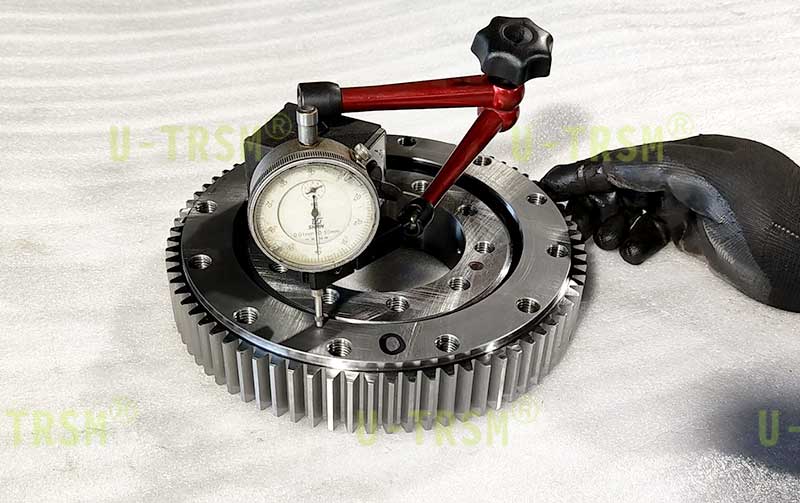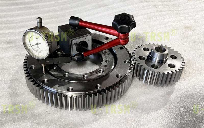 這是型號(hào)為011.16.160的精密四點(diǎn)球回轉(zhuǎn)支承及配套小齒輪,客戶用在自動(dòng)化設(shè)備上。回轉(zhuǎn)支承和齒輪都要求高精度磨齒,并且回轉(zhuǎn)支承要求0游隙,端跳和徑跳要小于等于0.02mm,旋轉(zhuǎn)靈活。最終實(shí)測(cè)負(fù)游隙,旋轉(zhuǎn)靈活,端跳、徑跳≤0.015mm。齒輪和回轉(zhuǎn)支承齒圈均達(dá)到6級(jí)齒精度要求,完全滿足客戶的使用要求。