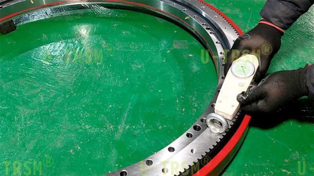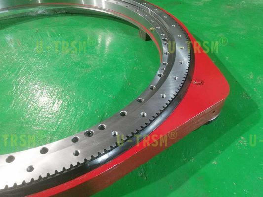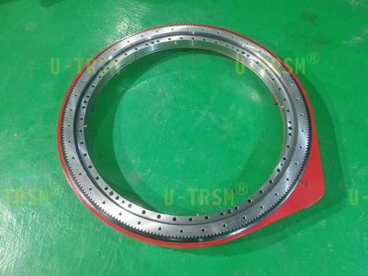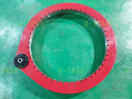 這是一款輕系列的直齒回轉驅動產品,適合客戶低載荷的工況。小模數,在直徑一定的情況下,模數越小齒的數量就越多,小齒輪相同,模數小,減速比就大,大減速比適合客戶的低轉速。回轉中心直徑941mm,滿足了客戶對大尺寸工件穩(wěn)定支承旋轉的需求。