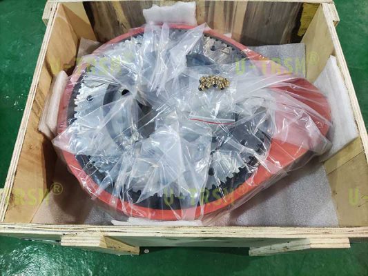 S-I-O-0229 精密直齒回轉(zhuǎn)驅(qū)動(dòng)應(yīng)用在工業(yè)自動(dòng)化設(shè)備上。客戶使用伺服電機(jī)為回轉(zhuǎn)驅(qū)動(dòng)提供動(dòng)力,讓我們配套精密行星減速機(jī),要求齒嚙合圓上的齒間隙≤0.1mm,這也就意味著回轉(zhuǎn)支承的游隙和徑向跳動(dòng)都要做的非常小。