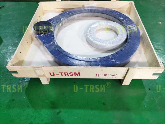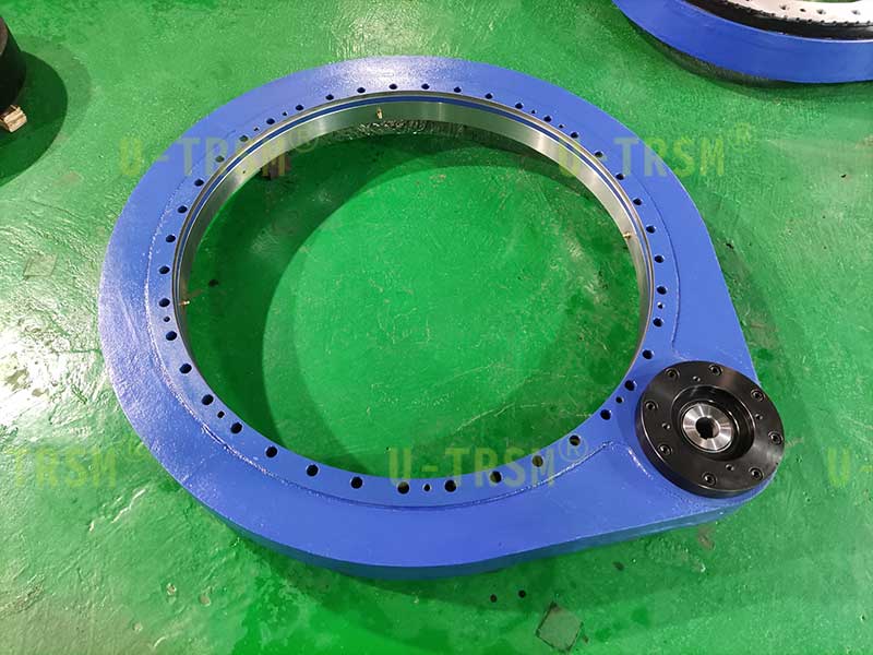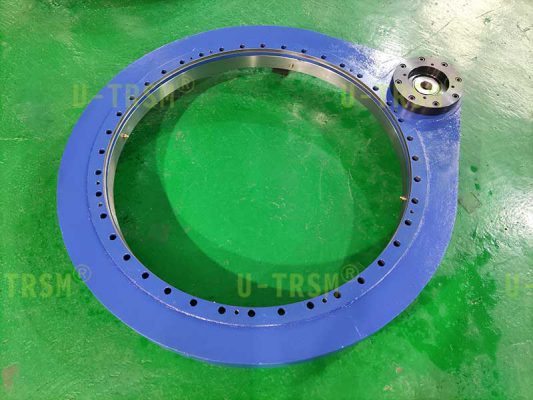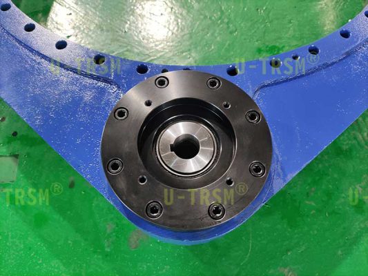 為了達到需要的減速比,在回轉(zhuǎn)驅(qū)動上面又連接了一個行星減速機,這一套裝置需要用伺服電機來驅(qū)動。因此,我們?yōu)榭蛻暨m配了減速機的連接法蘭和輸出軸,客戶可以直接把減速機連接到回轉(zhuǎn)驅(qū)動上使用,非常方便。