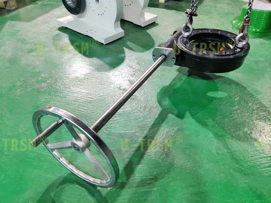 客戶(hù)的轉(zhuǎn)臺(tái)尺寸較大,離地高度比較低,如果手輪位置靠近回轉(zhuǎn)驅(qū)動(dòng),操作起來(lái)非常不方便也很不安全,所以我們?cè)O(shè)計(jì)了一根轉(zhuǎn)接軸,把手輪安裝在轉(zhuǎn)臺(tái)外面,這樣既方便操作又安全。