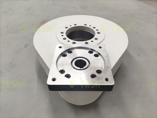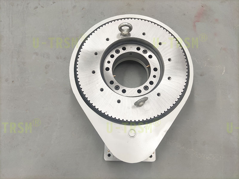回轉(zhuǎn)驅(qū)動(dòng)負(fù)責(zé)帶動(dòng)四工位工作臺(tái)旋轉(zhuǎn),到每個(gè)工位停止一段時(shí)間后,自動(dòng)旋轉(zhuǎn)到下一工位,如此循環(huán)使用。工作臺(tái)旋轉(zhuǎn)的時(shí)候有較大的偏載,需要大的扭矩才能順利轉(zhuǎn)動(dòng)工作臺(tái)。