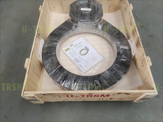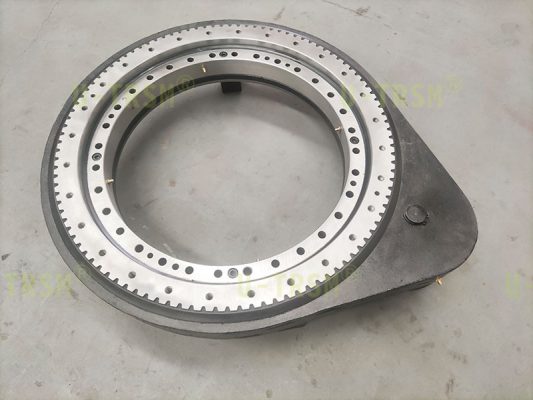 為了讓設(shè)備轉(zhuǎn)動(dòng)更平穩(wěn)回轉(zhuǎn)驅(qū)動(dòng)還是采用零游隙,為了精準(zhǔn)控制角度,齒圈和齒輪淬火后磨齒加工,淬火提高齒面硬度,增加扭矩,減少磨損,精度保持更久,磨齒可以保證良好精度?;剞D(zhuǎn)驅(qū)動(dòng)的輸入端客戶選擇了蝸輪減速機(jī)對(duì)回轉(zhuǎn)驅(qū)動(dòng)提供動(dòng)力,利用渦輪減速機(jī)具有機(jī)械自鎖這一特點(diǎn)提高設(shè)備整體的安全性。