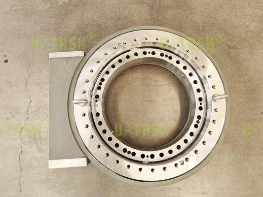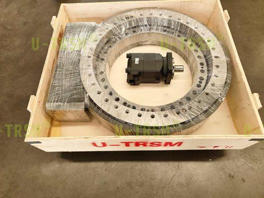 不二傳動(dòng)設(shè)備(洛陽(yáng))有限公司給客戶設(shè)計(jì)了一款大模數(shù),大扭矩,豎直安裝使用的蝸輪蝸桿式回轉(zhuǎn)驅(qū)動(dòng)。該回轉(zhuǎn)驅(qū)動(dòng)用在大型自動(dòng)化設(shè)備上,豎直安裝使用,載荷較大,并伴隨很大的傾覆力矩,回程旋轉(zhuǎn)時(shí)要求穩(wěn)定平順。經(jīng)過(guò)與客戶的多次溝通,不二傳動(dòng)的設(shè)計(jì)師根據(jù)客戶工況,推薦使用蝸輪蝸桿式回轉(zhuǎn)驅(qū)動(dòng),并使用大模數(shù)來(lái)增加回轉(zhuǎn)驅(qū)動(dòng)的扭矩,根據(jù)齒承載及力學(xué)性能分析,輸出扭矩可達(dá)近200KNm。