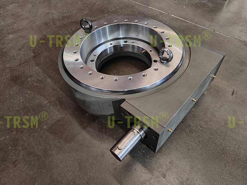 不二傳動(dòng)設(shè)備(洛陽(yáng))有限公司給客戶(hù)設(shè)計(jì)了一款大扭矩、高精度蝸輪蝸桿回轉(zhuǎn)驅(qū)動(dòng),應(yīng)用于大型自動(dòng)化包裝機(jī)械上,載荷較大,并且要求運(yùn)轉(zhuǎn)平穩(wěn),回程準(zhǔn)確。不二傳動(dòng)設(shè)計(jì)工程師根據(jù)客戶(hù)提供的工況,設(shè)計(jì)了此款回轉(zhuǎn)驅(qū)動(dòng),用大模數(shù)保證扭矩的輸出,其中回轉(zhuǎn)支承采用磨加工處理,保證溝道耐磨性及端面跳動(dòng),負(fù)游隙的設(shè)計(jì)使得回轉(zhuǎn)平穩(wěn),蝸桿采用特殊材料,蝸桿齒面淬火及磨齒處理,提高齒面的耐磨性及嚙合的精度。