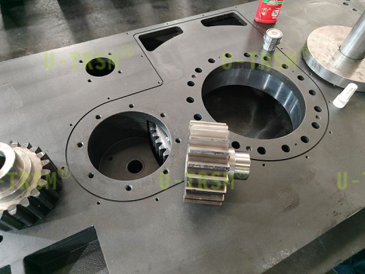 經(jīng)過與客戶的不斷溝通,反復(fù)進行3D設(shè)計模擬實驗,不二傳動給客戶研發(fā)了此款回轉(zhuǎn)驅(qū)動。雙齒輪的設(shè)計,一個為動力齒輪,另一個齒輪從動配合編碼器精準反饋旋轉(zhuǎn)角度。此款回轉(zhuǎn)驅(qū)動齒輪達到6級,使得回程間隙極大的減小,達到客戶的使用要求,并且集成于底座,集成化的設(shè)計在加工方面可以使得回轉(zhuǎn)驅(qū)動整體更為方便簡潔。